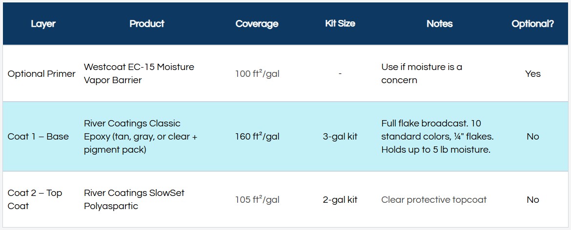 From primers and basecoats to flakes and topcoats, River Coatings kits are sized to your square footage with no guesswork.